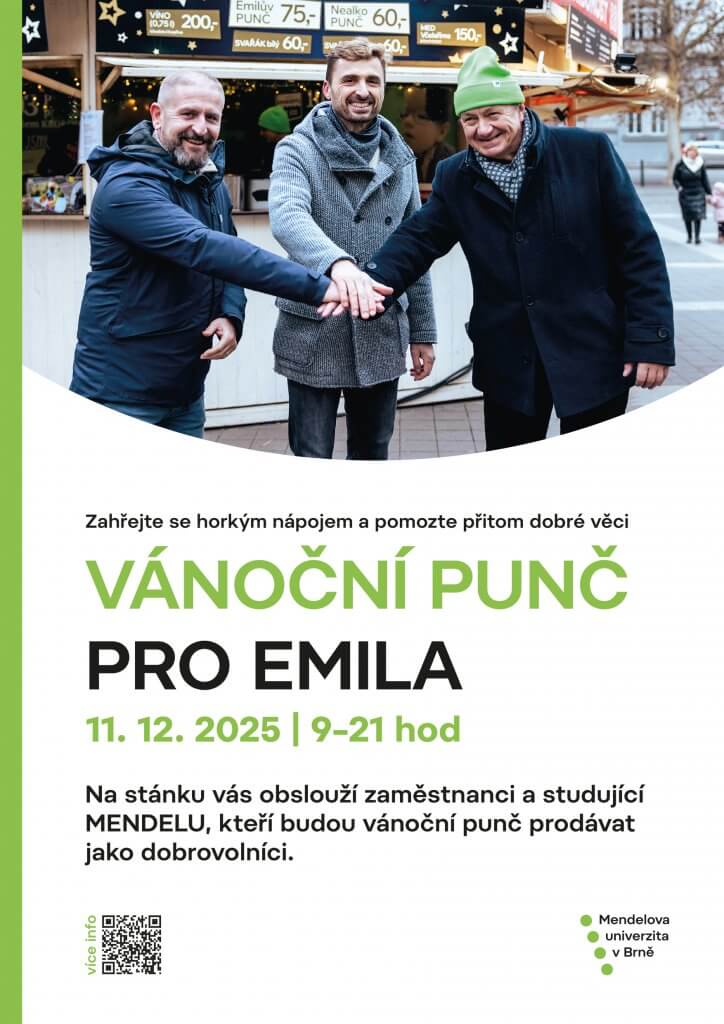 Přijměte pozvání na Emilův adventní stánek v Brně u Jošta ve čtvrtek 11. 12. 2025. Na stánku Vás obslouží zaměstnanci a vedení MENDELU, kteří budou vánoční punč prodávat jako dobrovolníci. Společně s Emilem letos podpoříme malou Elišku, která miluje pohyb. Budeme rádi, když se u stánku zastavíte – vaše návštěva i podpora pomůže. Užijte si s námi chvilku adventní pohody, od 9 do 21 hod se na vás těšíme!