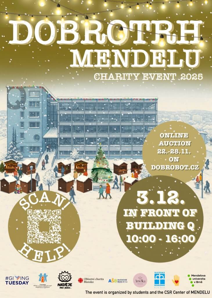 We kindly invite you to a traditional charity event called Dobrotrh MENDELU, which will take place on December 3 from 10 a.m. to 4 p.m. in front of Building Q at Mendel University in Brno. The event is organized by the MENDELU Center for Social Responsibility and Sustainability in cooperation with students of the Management Skills Seminar course. Each stand represents a non-profit organization that you can support by selecting items for a voluntary contribution. These items, which students obtain from sponsors or small donors, can serve as great Christmas gifts or you can treat yourself. The charity market will be preceded by a charity online auction from November 22 to 28 on the Dobrobot auction portal, where special donated items will be selected.
