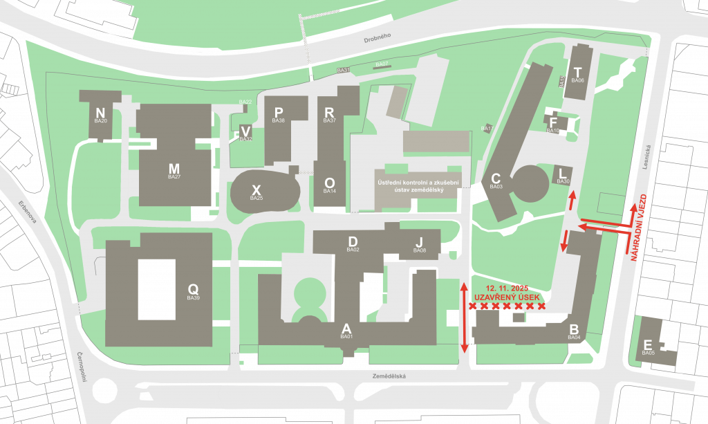 - Uzavírka průjezdu u objektu B – ve středu 12.11.2025 bude uzavřen průjezd kolem budovy B mezi strážnicí a zadním vstupem do objektu B z důvodu servisního zásahu společnosti EG.D, a.s. na trafostanici ve vnitrobloku. Servisní zásah se nijak nedotkne provozu objektů MENDELU, jde o trafostanici pro objekty ÚKZUZu. Vjezd do areálu k objektům T, L,C bude v tento den umožněn přes boční bránu za objektem B – viz plánek výše. Prosím berte v úvahu, že ulice Lesnická je v tomto místě jednosměrná (vjezd a výjezd tedy doporučujeme dle značení).